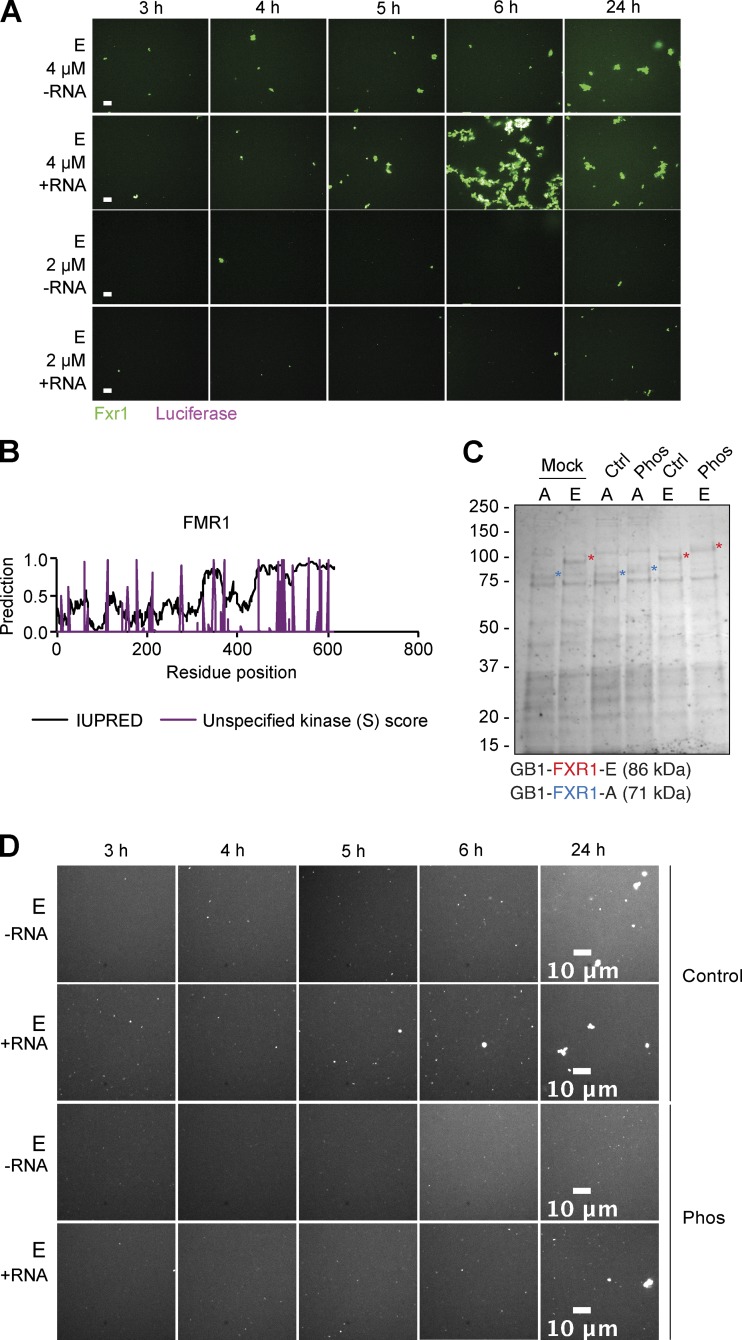 Figure S4. RNA addition and protein phosphorylation influence FXR1 aggregation in vitro. (A) Luciferase RNA accelerates isoform E aggregation. Representative images for either 4 or 2 µM isoform E with or without luciferase RNA after 3, 4, 5, 6, and 24 h. Scale bars, 10 µm. (B) FMR1 Predicted disorder (IUPRED) and unspecified kinase score for serine are marked for each aa. Predicted phosphorylated serines are uniformly distributed across the protein. (C) Coomassie staining of the in vitro–purified FXR1 isoforms A and E. Phosphorylation (Phos) results in a band shift with respect to the control (Ctrl) or mock-treated samples. (D) Representative images of 2 µM FXR1 isoform E (shown in white) with or without RNA and with or without phosphorylation (Phos) at 3, 4, 5, 6, and 24 h. Scale bars, 10 µm. Fig. S4 is linked to Fig. 6. |