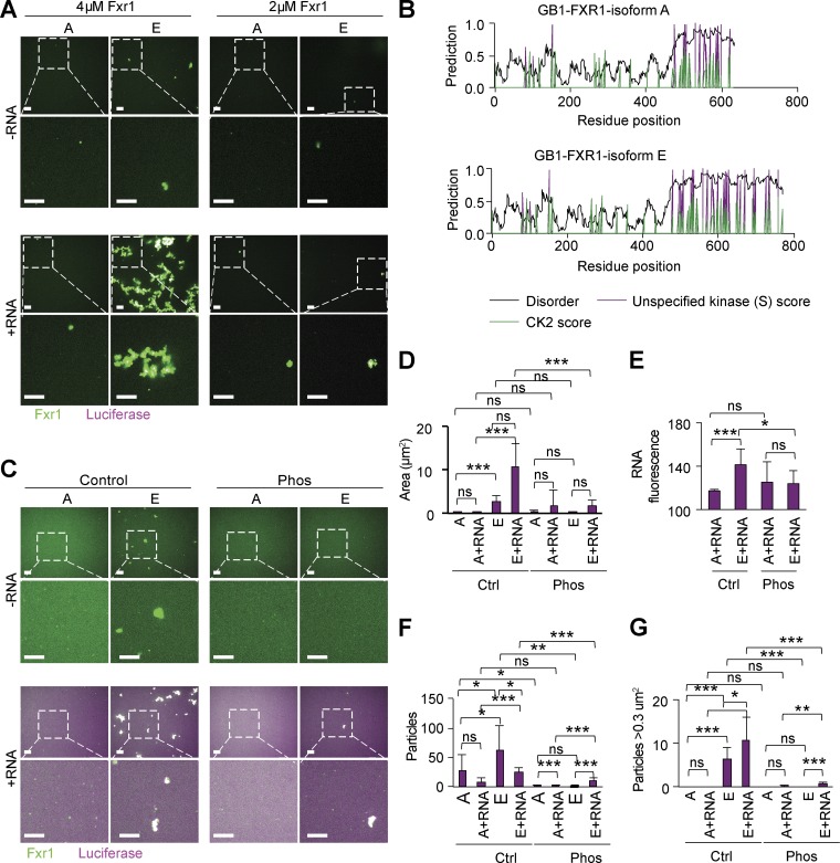 Figure 6. RNA promotes and phosphorylation inhibits FXR1 association in vitro. (A) Representative images of FXR1 isoforms A and E aggregates (2 or 4 µM) in the presence or absence of luciferase RNA (magenta). Scale bars, 10 µm. (B) Predicted disorder (IUPRED), unspecified kinase score and CK2 kinase scores for serine are marked for each aa. (C) Representative images of isoform A and E aggregates with or without RNA and with or without phosphorylation (Phos). Scale bars, 10 µm. (DâG) Quantification of particle area (D), RNA fluorescence within particles (E), number of particles (F), and number of particles >0.3 µm2 using the images represented in C. ***P < 0.001, **P < 0.01, *P < 0.05 (Studentâs t test, two sided). ns, not significant. |