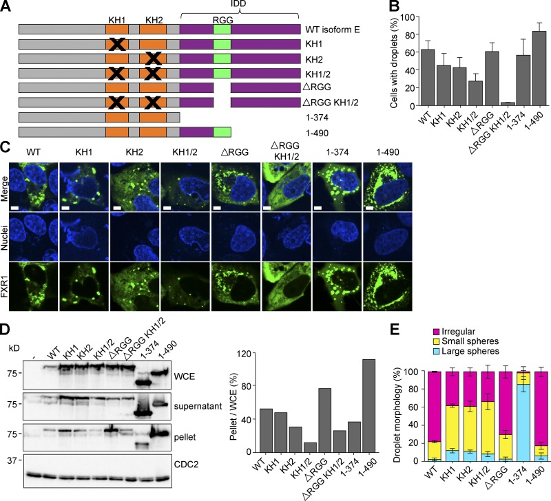 Figure 7. Phase separation is RNA binding dependent. (A) Location of mutations in the domains of isoform E. (B and C) U2OSÎFFF cells were transfected with WT PCMV2xTetO2-mNeonGreen-FXR1 isoform E (pAGB1162), plasmids with mutated KH1 (pAGB1171), KH2 (pAGB1172), KH1/2 (pAGB1173), RGG (pAGB1174), RGG and KH1/2 (pAGB1175), complete IDD (pAGB1176), or partial IDD (pAGB1177). All constructs were induced with 25 ng/ml Tet to endogenous levels. Black Xs indicate mutated regions. (B) Quantification of droplet formation. n > 350 cells from three experiments. (C) Representative images of cells expressing the different mutants. Scale bar, 5 µm. (D) Whole-cell extracts (WCE), lysate, and pellets were analyzed by Western blotting using an antibody against FXR1. Right: percent protein in the pellet quantified as in Fig. 5. (E) Quantification of droplet morphology using the same three categories that were used in Fig. 5. Data are means ± SEM. |