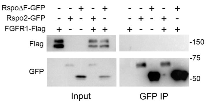 Fig. S5. Lack of Rspo2 association with FGFR1. RNAs encoding different GFP- tagged Rspo2 constructs and/or FGFR1-Flag were injected into four-cell embryos, ectoderm explants were isolated at midblastula stages and cultured until stage 12 for immunoprecipitation (IP) with GFP. FGFR1 is not pulled down with Rspo2-GFP or RspoâF-GFP.