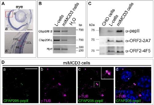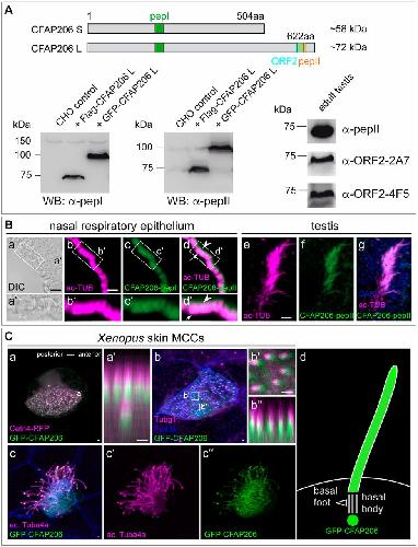 Fig. 3. Subcellular localisation of CFAP206 protein to the axoneme and basal bodies. (A) Schematic depiction of short (CFAP206S; upper row) and long (CFAP206L; lower row) CFAP206 protein. Coloured boxes indicate position of peptides (green, pepI; orange, pepII; cyan, ORF2) used to generate antibodies. Detection of tagged CFAP206 overexpressed in CHO cells and of endogenous CFAP206 protein in lysates of mouse testis with the different antibodies. The full-size western blots are shown in Fig. S9. (B) Localisation of endogenous CFAP206 (anti-pepII) to cilia on respiratory epithelial cells (a-d) and flagella of spermatozoa (e-g). Boxed areas in a-d indicate the region shown in aâ²-dâ². Arrowheads in d and dâ² indicate localisation of CFAP206 non-overlapping with acetylated α-tubulin (ac-TUB). Arrows highlight ciliary tips, which lack CFAP206. (C) Subcellular localisation of murine GFP-CFAP206 in Xenopus skin MCCs. (a) Co-staining with the basal body marker centrin4-RFP (Cetn4-RFP; a). Orthogonal projection shown in aâ² demonstrates partial overlap at the basal body. (b) Co-staining with phalloidin to highlight F-actin and the basal foot marker tubulin gamma-1 (Tubg1) confirmed basal body staining (bâ²) and partial overlap at the basal foot (bâ²). (c-câ²) Axonemal staining, as shown by co-staining with an antibody against acetylated alpha-tubulin (ac-Tuba4a). (d) Cartoon of GFP-CFAP206 localisation at the Xenopus cilium. Scale bars: 10â