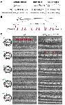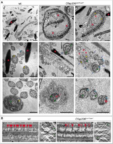 Fig. 8. Electron microscopic analysis of wild-type and Cfap206Îex4/Îex4 mutant sperm. (A) TEM analysis of wild-type (a-c) and Cfap206Îex4/Îex4 (d-h) epididymis sperm. (a-c) Overviews of wild-type sections; red stars, sperm heads; blue arrow, fibrous sheath; yellow star, mitochondria; green stars, ODFs. (d,e) Longitudinal section through Cfap206Îex4/Îex4 circular (d) or bent (e) axonemes surrounding vesicular material (red asterisks). (f) Groups of axonemes (marked with white asterisks) surrounded by a single plasma membrane (dark-blue arrows in fâ², magnified region of the black outlined area in f) and axonemal profiles with apparently normal microtubule doublets (green arrows in white outlined inset). (fâ²) Vesicular structures (red asterisks) and multiple axonemal profiles from the midpiece and principal piece region [indicated by the presence of mitochondria (yellow stars) and fibrous sheath (light-blue arrows)] with disorganized microtubules and ODFs (green stars) surrounded by a single plasma membrane (dark-blue arrows). (g) Axonemal profile of the midpiece region showing few irregular single microtubules (red arrow) and ODFs (green stars). (h) Axonemal profiles of principal pieces with disorganized ODFs (green stars) and microtubules surrounded by fibrous sheaths (light-blue arrows). (B) Electron tomography revealed radial spokes (red arrowheads) between the inner central pair of microtubules and the outer microtubules (anchored at the A-tubule) in wild type (a). Radial spokes (red arrowheads, RS1-3) appeared in a repetitive pattern, interrupted by electron lucent gaps repeating every 96â