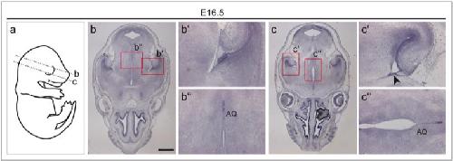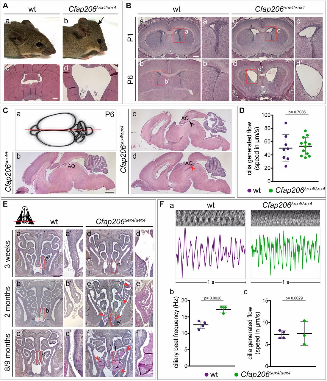 Fig. 6. Enlarged ventricles and mucus accumulation in Cfap206δex4/δex4. (A) External views (a,b) and Hematoxylin and Eosin-stained coronal sections (c,d) of wild-type (a,c) and Cfap206δex4/δex4 (b,d) heads revealed domed skull, and expanded and fused ventricles of Cfap206δex4/δex4 mutants. (B) Hematoxylin and Eosin-stained coronal sections of wild-type (a-bâ²) and Cfap206δex4/δex4 mutant (c-dâ²) brains demonstrated the presence of enlarged ventricles on postnatal day 1 (P1). Boxed areas in a-d indicate the regions shown at higher magnification in aâ²-dâ². (C) (a) Schematic representation of a P6 brain. Red line indicates plane of section. The mid-sagittal sections of heterozygous Cfap206δex4 (representing wild-type condition; b) and homozygous Cfap206δex4 mutants (c,d) were Hematoxylin and Eosin stained to visualise the aqueduct (AQ). Homozygous mutants showed stenotic (black arrowhead in c) or obstructed (red arrowhead in d) aqueducts. (D) Cilia-generated ventricular flow at P7 was comparable in wild-type and Cfap206δex4/δex4 littermates. Each dot represents the average speed of all tracked particles of a single individual (wild type n=8 and Cfap206δex4/δex4 n=12). Numerical values used to generate the dot plot are shown in Table S5. (E) Coronal sections of wild-type (a-câ²) and Cfap206δex4/δex4 mutant (d-fâ²) nasal cavities, demonstrating progressive mucus accumulation in mutants. Boxed areas in a-f indicate regions shown at higher magnification in aâ²-fâ². (F) Kymographs and derived CBF. (a) Representative kymographs (upper panels) and plotted values (lower panels) of wild-type (violet) and Cfap206δex4/δex4 (green) tracheal cilia motility (t=1â