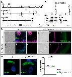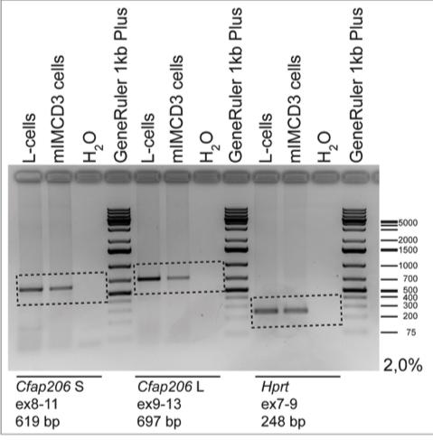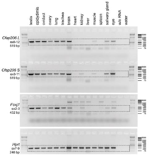 Fig. 1. The structure of the mouse Cfap206 and Cfap206 expression. (A) Schematic depiction of the Cfap206 genomic structure, transcripts and resulting proteins. The Cfap206 gene consists of 13 exons (middle row) that give rise to two transcripts: a short form (Cfap206 S; upper row) and a long form (Cfap206 L; lower row), generated by the differential use of a splice donor site in exon 11. Grey boxes indicate ORFs, white boxes indicate the 5â²- and 3â²-UTR. PCR Cfap206 S and PCR Cfap206 L indicate the position of primers and PCR products used to distinguish between both transcripts. Blue box marks the region used to generate the in situ hybridisation probe, which detected both transcripts. (B) Correlation of Cfap206 S, Cfap206 L and Foxj1 expression in adult tissues assessed by RT-PCR. Hprt was used as quality control. The full-size agarose gel is shown in Fig. S7. (C) Expression of Cfap206 in adult tissues detected by section in situ hybridisation. Boxed areas in a-e indicate the regions shown at higher magnification in aâ²-eâ². Arrowheads indicate regions of expression. CP, choroid plexus. (D) Expression of Cfap206 in tissues developing or carrying motile cilia at E17.5 detected by section in situ hybridisation. Boxed areas in a-d indicate the regions shown at higher magnification in aâ²-dâ². (E) Dependence of Cfap206 expression on FOXJ1. Whole-mount in situ hybridisation (a,d) and section in situ hybridisation (b,c,e,f) on wild-type (a-c) and Foxj1 mutant (d-f) E8.0 embryos (a,d), and E17.5 nasal cavities (b,e) and lungs (c,f). Red boxes in b,c,e,f indicate regions enlarged in bâ²,câ²,eâ²,fâ². Cfap206 expression was reduced or nearly absent in the mouse left-right organiser (LRO), the respiratory epithelium and bronchi of Foxj1 mutants (red arrowheads in d,eâ²,fâ²). Scale bars: 500â