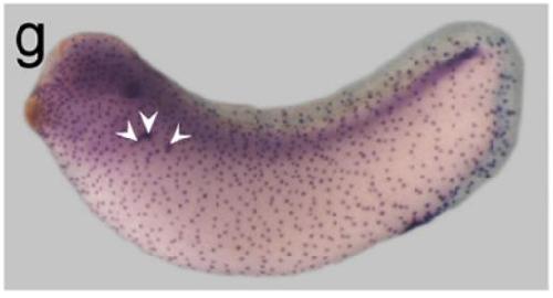 cfap206 (cilia and flagella associated protein 206) gene expression in a X. laevis embryo, assayed via in situ hybridization NF stage 29, lateral view, anterior left, dorsal up. |