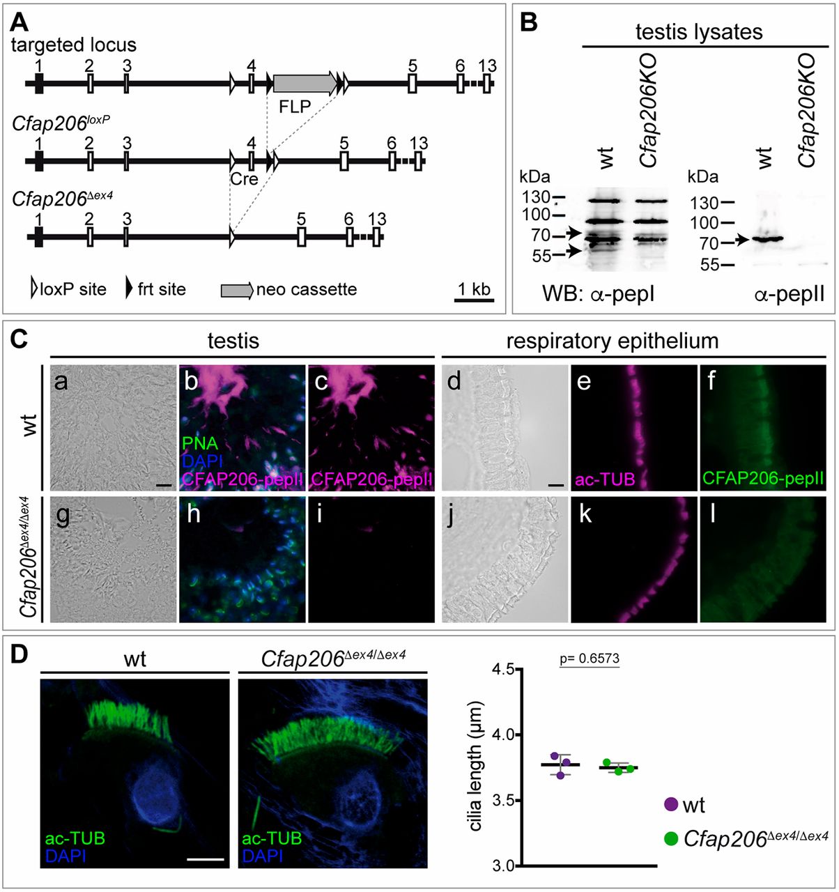 Fig. 5. Generation and characterisation of a Cfap206-null mouse. (A) Schematic drawing depicting the structure of the targeted locus, the locus after FLP-mediated removal of the neo cassette (Cfap206loxP) and following Cre-mediated excision of exon 4 (Cfap206δex4). (B) Western blot analysis of testis lysates of wild-type and Cfap206δex4/δex4 mice with anti-pepI and anti-pepII antibodies demonstrated absence of both CFAP206 protein variants in mutant tissue. Arrows indicate the expected sizes of the CFAP206 proteins. The full-size western blots are shown in Fig. S10. (C) Indirect immunofluorescence staining of wild-type (a-f) and Cfap206δex4/δex4 (g-l) testis (a-c,g-i) and respiratory epithelium (d-f,j-l) sections for CFAP206, indicating loss of staining in mutant tissues. (D) Analysis of cilia length in mouse tracheal epithelial cells (mTECs) isolated from wild-type and Cfap206δex4/δex4 mutants revealed no change in ciliary length upon CFAP206 loss. Each dot represents the average cilia length of one specimen analysed (n=3). Graph in D displays respective values as mean±s.d. Raw data are shown in Table S4. Scale bars: 10â