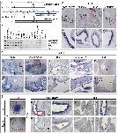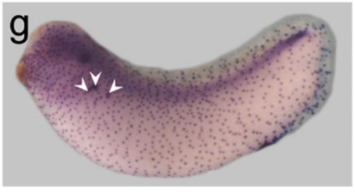 Fig. 2. cfap206 is co-expressed with and dependent on foxj1 in Xenopus laevis. (A) Analysis of foxj1 and cfap206 mRNA expression in staged embryos using antisense RNA probes. (a,e) In gastrula stage 10 embryos, foxj1 transcripts were present in the LRO precursor, the superficial mesoderm (SM; a), while cfap206 was not detected by in situ hybridisation (e). Histological sections (bâ²,fâ²; planes of sections indicated by red dashed lines in b,f) of stage 19 dorsal explants (b,f) revealed overlapping expression of foxj1 (b,bâ²) and cfap206 (f,fâ²) in the floor plate (FP), while in the gastrocoel roof plate (area of LRO; outlined by dashed lines in b,f), only cfap206 transcripts were detected. Staining in b reflects expression in the floorplate above the LRO. (c,g) In stage 29 larvae, both genes were co-expressed in the nephrostomes (white arrowheads) and MCCs. (d,h) In the head of stage 45 tadpoles, strong neural expression of foxj1 was seen in the sub-commissural organ (SCO), zona limitans intrathalamica (ZLI) and FP (dâ´). Transcripts of cfap206 were detected in the same tissues; however, at reduced levels (hâ´). Non-neural expression was found in the stomach (stom.; dâ²,hâ²) and in dorsal cells lining the branchial chamber (BC; dâ²,hâ²). (B,C) cfap206 is a foxj1 target gene. (B) Strong cfap206 induction in embryos unilaterally injected with foxj1 mRNA. Asterisk indicates injected side. (C) Reduction of cfap206 expression in stage 24 foxj1 F0 crispant embryos (b,bâ²) when compared with wild type (a,aâ²). Boxed areas in a,b indicate the regions shown at higher magnification in aâ²,bâ². Scale bars: 100â