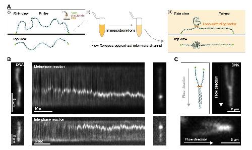 Figure 1: Single DNA molecule assay for direct visualization of DNA looping in Xenopus egg extracts. (A) (i) Side and top view schematics of a single strand of λ-phage DNA attached to a functionalized cover slip via biotin-streptavidin linkers. (ii) Xenopus egg extract is flowed into the microfluidic chamber. (iii) Side and top view schematics visualizing how soluble active loop-extruding factors extrude loops in H3-H4-depleted extract. (B) Dynamics of the formation of DNA loops induced by H3-H4-depleted extract in metaphase (upper) and interphase (lower). Snapshot of a single molecule of λ-phage DNA visualized using Sytox Orange preceding treatment with H3-H4-depleted extract (left). Kymograph of DNA signal over time displaying a looping event upon addition of H3-H4-depleted extract (middle). Snapshot of steady-state DNA looping event after ~60 sec (right). (C) Hydrodynamic flows reveal loop topology within DNA cluster. (i) Schematic of the loop topology revealed upon flow. (ii) Topology of extract-induced DNA loops in metaphase (upper) and interphase (lower) visualized using Sytox Orange revealed upon flow in the direction of the arrow. |