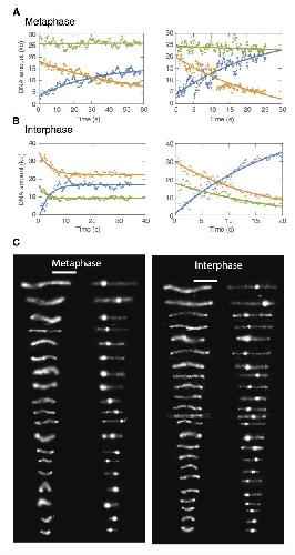 Supplementary Figure 2: DNA looping examples demonstrating non- symmetric loop extrusion in metaphase and symmetric loop extrusion in interphase. We tracked the position of the loop and segmented the DNA signal into a loop region (blue) and region I and II (orange and green). The integrated fluorescence intensity in each region was converted into the relative amount of DNA in that region as described above and plotted as a function of time. The dots are data from the analysis and the lines represent single exponential fits to the data. (A) In metaphase, we observed a saturating exponential increase in the DNA amount in the looped region, and only a single non-looped region decreasing in DNA amount, suggestive of non-symmetric loop extrusion. (B) In interphase, we observed a similar saturating exponential increase in the DNA amount in the looped region, whereas both non-loop regions decreased in DNA amount, suggestive of symmetric loop extrusion. (C) Representative snapshots of DNA looping in H3-H4-depleted interphase and metaphase extracts ordered by end-to-end distance. Left image represents the initial DNA configuration and right image the corresponding final loop configuration. Scale bar is 5 micro-m. |