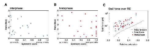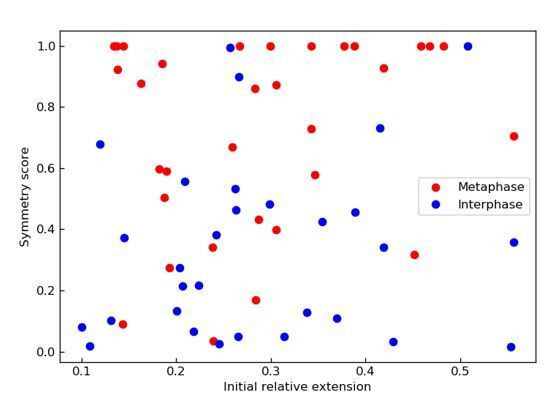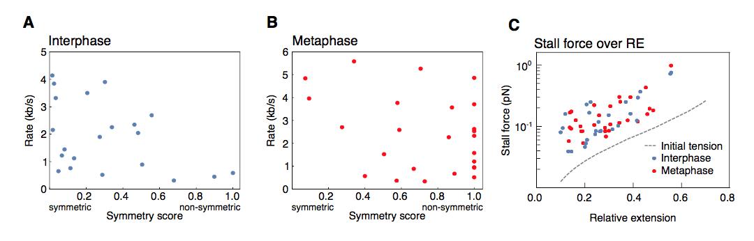 Supplementary Figure 6: Dependency of loop extrusion rate on extrusion symmetry and stall forces on initial relative DNA extension. We quantified the loop extrusion rate as a function of extrusion symmetry (symmetry score) in both (A) interphase and (B) metaphase (C) for the events corresponding to Figure 2C. Using the worm-like chain model41, we computed the stall forces for both interphase and metaphase looping events from the plateau size of the loop and plot these values as a function of initial relative extension of the DNA strand before the loop formed. The hatched line shows the initial tension on the DNA strand before the onset of loo formation as a function of end-to-end distance of the DNA molecules. The resulting stall forces are conserved between inter- and metaphase and show a slight dependency on the initial relative extension of the DNA strand, possibly by selecting for stronger loops in stretched-out DNA molecules. |