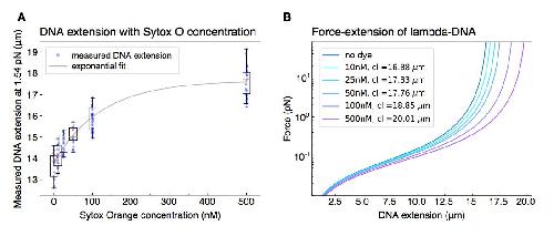 Supplementary Figure 7: Dye-induced DNA lengthening. (A) To correct for the concentration-dependent lengthening of DNA by intercalating dye Sytox Orange, we measured the extension (in ïm) of DNA molecules that we hydrodynamically stretched using a buffer flow-rate corresponding to 1.54 pN, for all Sytox Orange concentrations employed in the study. The exponential fit to the data serves as a guide to the eye. (B) The corresponding contour lengths (cl) were determined for each dye concentration by applying the worm like chain model41 to the average measured DNA extension at the known stretching force of 1.54 pN. |