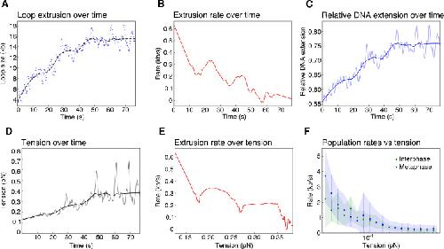 Figure 2—figure supplement 2. Biophysical characterization of loop extrusion rate and DNA tension.(A) Example of one metaphase loop extrusion event (blue dots) smoothed by a Savitzky-Golay filtering with a 2nd-order polynomial and a window size of 63 points (black dashes). (B) The extrusion rate of the looping event was obtained from the first-order derivative of the smoothed curve. (C) Relative DNA extension was calculated as the end-to-end distance divided by the amount of DNA outside of the loop region using the raw loop data (blue shaded curve) and the smoothed loop data from (A). (D) Tension on the DNA strand, resulting from the reeling of DNA into the loop, was obtained from applying the worm like chain model (Marko and Siggia, 1995) for DNA to the relative extension values in (C) with the raw data as the shaded curve. (E) Rate of loop extrusion plotted over the tension on the DNA strand for the single looping event in (A). (F) Loop extrusion rates over DNA tension for the population of metaphase (blue dots and envelope) and interphase looping events (green dots and envelope) from exponential fit curves to the loop data. Dots represent mean values, error bars and envelope represent standard deviation. |