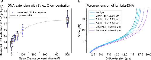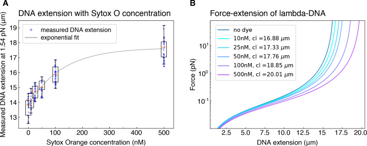 Figure 2âfigure supplement 6. Correction for dye-induced DNA lengthening.(A) To correct for the concentration-dependent lengthening of DNA by intercalating dye Sytox Orange, we measured the extension (in μm) of DNA molecules that we hydrodynamically stretched using a buffer flow-rate corresponding to a force of 1.54 pN, for all Sytox Orange concentrations employed in the study. The exponential fit to the data serves as a guide to the eye. (B) The corresponding contour lengths (cl) were determined for each dye concentration by applying the worm like chain model (Marko and Siggia, 1995) to the average measured DNA extension at the known stretching force of 1.54 pN. |