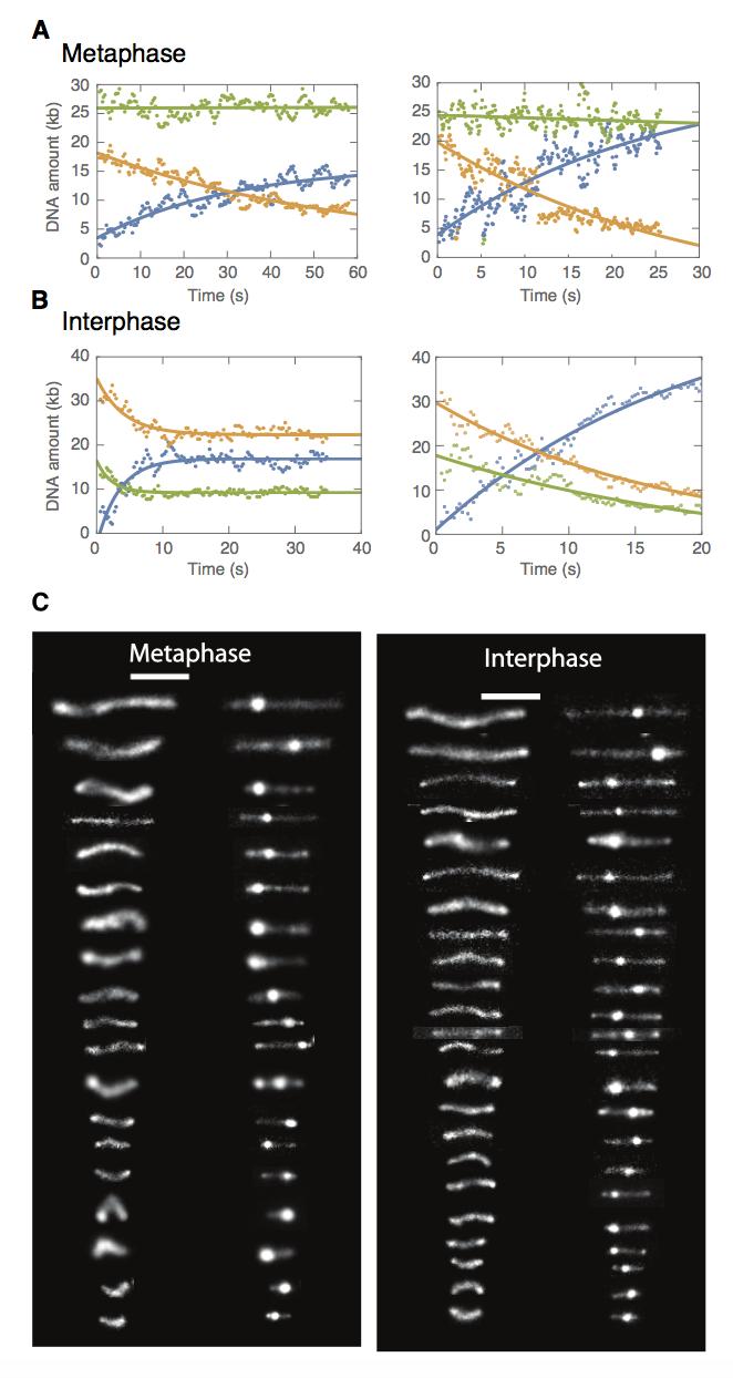 Figure 2âfigure supplement 3. Examples of symmetric DNA loop extrusion in metaphase and non-symmetric loop extrusion in interphase.We quantified the amount of DNA inside the loop (blue dots) and the regions left and right of the loop (region I in orange and region II in green) from the relative integrated DNA fluorescence intensities in each region for each time point. The lines represent exponential fits to the data. (A) Examples of metaphase looping events exhibiting two-sided (symmetric) DNA loop extrusion where DNA is reeled in from both regions outside of the loop. (B) Examples of one-sided (non-symmetric) DNA loop extrusion events in interphase, showing one-sided reeling of DNA into the loop from only one region outside of the loop. |