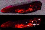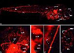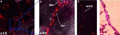 Fig. 1. DiI-Ac-LDL labels the vasculature of Xenopus embryos. (a) 10 magnification confocal image and (b) 40 magnification confocal image of vessels