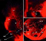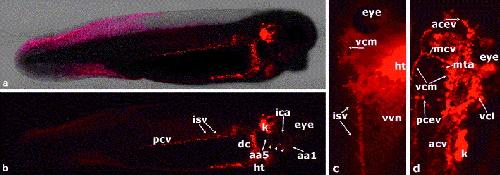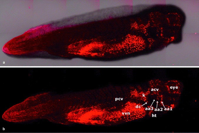 Fig. 2. Vasculature of stage 33/34 embryos at the initiation of the heart beat. Confocal images of (a) DIC and fluorescence and (b) fluorescence alone showing the heart (ht), first aortic arches (aa-3), eye, anterior (acv), and posterior (pcv) cardinal veins which drain into the pronephric sinus (k) and Duct of Cuvier (dc), and vascular vitelline network (vvn). The width of each z-slice is 23.5 m. |