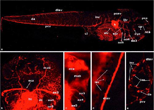 Fig. 6. Vasculature of stage 46 embryo. (a) Confocal image (z-width 1.0 m) of a lateral view of a stage 46 embryo showing the nasociliary artery and the expanding capillary networks of the dorsal head and between the intersomitic vessels (isv). (b, c) Ventral views of stage 46 embryos showing the extensive vascular supply to the filter apparatus, particularly the ventralmost venous drainage into the musculoabdominal veins (mab). The musculoabdominal veins drain into the Duct of Cuvier (dc) lateral to the heart. The persisting aortic arches (3â5) can also be seen (aa3â 5) and supply the external carotid artery (eca) and the pulmonary artery. (b) A confocal image (z-width 66.9 m) and (c) was taken with wide-field microscopy. (d) Dorsal view of the tail of a stage 46 embryo showing the dorsal longitudinal anastomosing vessel (dlav) with paired intersomitic vessels sprouting off of the dlav at regular intervals (wide-field microscopy). (e) A 10- m frozen section of a stage 46 tail showing the existence of a pair of intersomitic arteries (isa) and veins (isv) at the same intersomitic junction and the arrangement of the isa medial to the isv (taken with wide-field microscopy). |