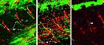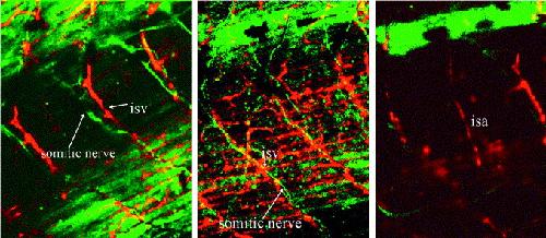 Fig. 10. Codevelopment of somitic nerves and intersomitic vessels. Single 12.4- m z-slices from a confocal image of a stage 46 embryo expressing a tau-gfp construct and injected with DiI-Ac-LDL. (a) Both the somitic nerves (green) and the intersomitic veins (isv) are visualized and can be seen in close proximity (20 magnification). (b) and (c) are individual slices in the same z-stack (10 magnification) showing colocalization of the somitic nerves with the veins (b) and not arteries (c). |