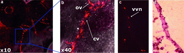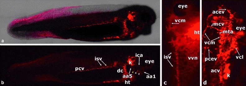 (arrowhead). (c) a 40 wide field microscopy image of DiI-Ac-LDL labeling of the vascular vitelline network (vvn) in a 10- m frozen section of a stage