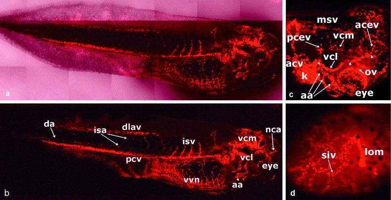 Fig. 4. Vasculature of stage 40â41 embryos. Confocal images (z-width 43.4 m) of (a) DIC and fluorescence and (b) fluorescence only of a stage 40 embryo showing the vena capitis lateralis (vcl) and the vena capitis medialis (vcm) and the further sprouting of the intersomitic vessels (isa, isv). (c) Confocal image (z-width 38.4 m) of a dorsolateral view of the head of stage 41 embryo showing the anterior cerebral vein crossing the head (acev) and the many small capillaries that cross the head between the cerebral veins, as well as the dominance of the vcl over the vcm. (d) Ventral view of a stage 41 embryo gut showing the subintestinal vein (siv) draining into the left omphalomesenteric vein (lom), taken with wide-field microscopy. |