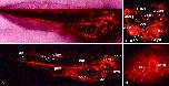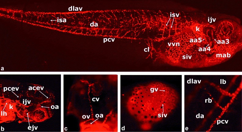 Fig. 5. Vasculature of stage 43 embryos. (a) Confocal image (z-width 24.9 m) of the profile of stage 43 embryo showing the musculoabdominal vein crossing from the ventral aspect of the head to the Duct of Cuvier, the right side position of the subintestinal vein, and the further definition and capillary sprouting of the intersomitic vessels. (b) Confocal image (z-width 42.3 m) of a dorsolateral view of stage 42/43 embryo head showing ophthalmic artery (oa) entering the eye and the crossing of the external jugular vein (ejv) from the ventral head to the Duct of Cuvier. The lymph heart (lh) may also be seen. (c) Wide-field microscopy image of a dorsal view of lateral head of stage 43 embryo showing ophthalmic artery (oa) supplying blood to the eye and the ophthalmic vein (ov) draining the eye. The relationship of the ophthalmic artery arching over the ophthalmic vein can be seen. The ophthalmic vein drains into the internal jugular vein (ijv) whose tributaries include the anterior part of the cerebral vein that loops around the olfactory bulb. (d) Ventral view of the gut of a stage 43 embryo showing the subintestinal vein on the right side of the gut, draining the gastric vein (wide-field microscopy). (e) Lateral view of the dorsal longitudinal anastomosing vessel (dlav) draining into the merged posterior cardinal vein (pcv) by the dominant left branch (lb) and the lesser right branch (rb) (wide-field microscopy). |