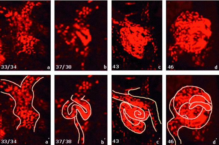 Fig. 8. Development of the vasculature of the pronephric sinus from stage 33/34 to stage 46 showing the progressive folding of the sinus into a tangled knotof vessels. (aâd) Magnifications of confocal images with z-widths of 23.6, 37.8, 43.4, and 22.0 m, respectively. (a âd ) are tracings of (aâd). |