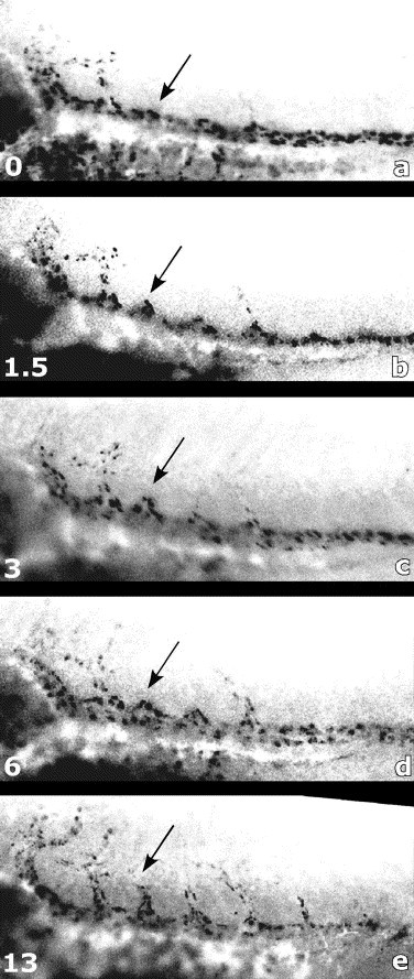 Fig. 9. Negative image of progressive outgrowth of the intersomitic vessels in a live embryo. Embryos were injected at stage 33/34 with DiI-Ac-LDL, reanesthetized every 1.5â3 h, and imaged using a Zeiss Axioplan (widefield microscopy). A typical time series is shown with representative images from stage 33/34 (time 0), and 1.5, 3, 6, and 13 h later. The third intersomitic vessel is indicated as a reference for following single vessel outgrowth. The image is presented as a negative black/white image, where black represents the fluorescent signal. |