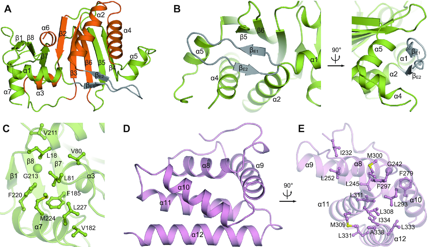 Figure 2. Structural details of FAM46B domains. (A) Overall structure of NCD with secondary elements assigned. The NTase core is specified in orange. (B) The ambient interactions of the featured β-hairpin in FAM46B NCD. (C) The local hydrophobic cluster next to the NTase core. Side chains of involved residues are shown as ball-and-stick models. (D) Overall structure of HD. (E) Hydrophobic interactions that stabilize HD.