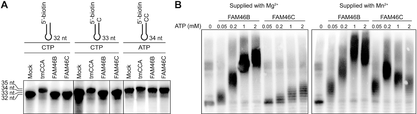 Figure 4. FAM46B has PAP activity. (A) Test for CCA-adding activity for human FAM46B and mouse FAM46C. 10 μM 5â²-biotinylated mini-tRNA primers with different 3â² tails as indicated were individually incubated with 10 μM protein in the presence of 2 mM ATP or CTP for 50 min. tmCCA was used as a positive control. (B) Polyadenylation activity for human FAM46B and mouse FAM46C. 10 μM 5â²-biotinylated A15 primer was incubated with 10 μM FAM46B or FAM46C in the presence of 4 mM Mg2+ or Mn2+ for 50 min. ATP was supplied with increasing concentrations as indicated.