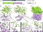 Figure 1. Overall structure of FAM46B. (A) Schematic representation showing the organization of crystallized construct based on full-length FAM46B. NCD, N-terminal catalytic domain; HD, helical domain. Borders of each domain are indicated by residue numbers. (B) Structure of FAM46B. Domains of FAM46B are indicated and colored as in A. The two featured β-hairpin is colored gray. (C) Surface representation of FAM46B with the inter-domain cleft indicated by dashed ellipse. (D–G) Interactions between NCD and HD. Side chains of involved residues are shown as ball-and-stick models in the same color as the domains they belong to.