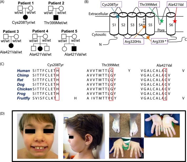 Figure 1. (A) Pedigrees of the five unrelated affected individuals (closed symbols) with de novo KCNC1 variants and status of healthy family members (open symbols). wt indicates for wild type. (B) Graphical illustration of the KV3.1 channel demonstrates the domain structures. The positions of the identified variants (Cys208Tyr, Thr399Met, Ala421Val) and the previously published variants (Arg320His and Arg339*) are highlighted with stars. The plus sign illustrates the positively charged arginine in the voltageâsensing S4 segment.21 (C) Amino acid sequences across different species indicate that the variants are localized in highly conserved regions. (D) Images of patient 2 at 11Â years of age show hypertelorism, long palpebral fissures, broad nose, large ears, diastema, small chin, and sandal gap. The hands of patient 2 do not have any dysmorphic features.