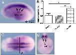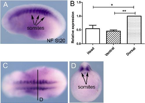 Fig. 2. Expression of Polr3g in Xenopus tropicalis embryos. Expression analysis of Polr3g Xenopus tropicalis at NF stage 20. (A) Lateral view of NF St20 embryo analysed by in situ hybridization for Polr3g; expression in the somites is indicated; anterior is to the left. (B) qRT-PCR for Polr3g expression in the early tailbud (NF St23). Head, Ventral and Dorsal sections were dissected and RNA extracted for qPCR. Ct values were normalised to the gene Dicer. All expression values were calculated relative to somite expression. One-way ANOVA statistical analysis was carried out on relative expression of each section for each gene (*) represents the level of significance. (C) Dorsal view of NF St20 embryo analysed by in situ hybridization for Polr3g; a cross-section through the embryo shown in (D) is indicated; anterior is to the left. (D) Cross section of embryo shown in (C) shows specific expression of Polr3g in somites at NF St20. |