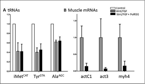 Fig. 7. Polr3g overexpression restricts myogenic differentiation in an explant model of myogenesis without eliciting any recovery of tRNA expression, qRT-PCR analysis of RNA extracted from explants injected with either Fgf4 â+ âWnt8, or Fgf4+ Wnt8 â+ âPolr3g and cultured to stage 25. (A) Analysis shows a significant decrease in tRNA isoacceptors for iMethionineCAT, TyrosineGTA and AlanineAGC in both experimental groups as compared to uninjected control explants at stage 25. Pair-wise t-tests were carried out for each tRNA's mean relative expression comparing the mean Ct values normalised to control gene Dicer, for the three biological replicates, between the uninjected controls and the experimental groups. Error bars represent SEM. (B) qPCR analysis shows high increase in differentiation specific mRNAs actc1, act3 and myh4 activated by myogenic inducing factors FGF4+Wnt8. The mean relative expression of two biological replicates was plotted (muscle gene expression is not detectable in un-induced animal caps). Mean fold changes of 3306 (actc1), 249,870 (act3) and 96,436 (myh4) were found in Fgf4/Wnt8 samples and set to 1.0; these were reduced to 14%, 7% and 15% of this level, respectively, when Polr3g was co-expressed. Error bars represent SEM. |
