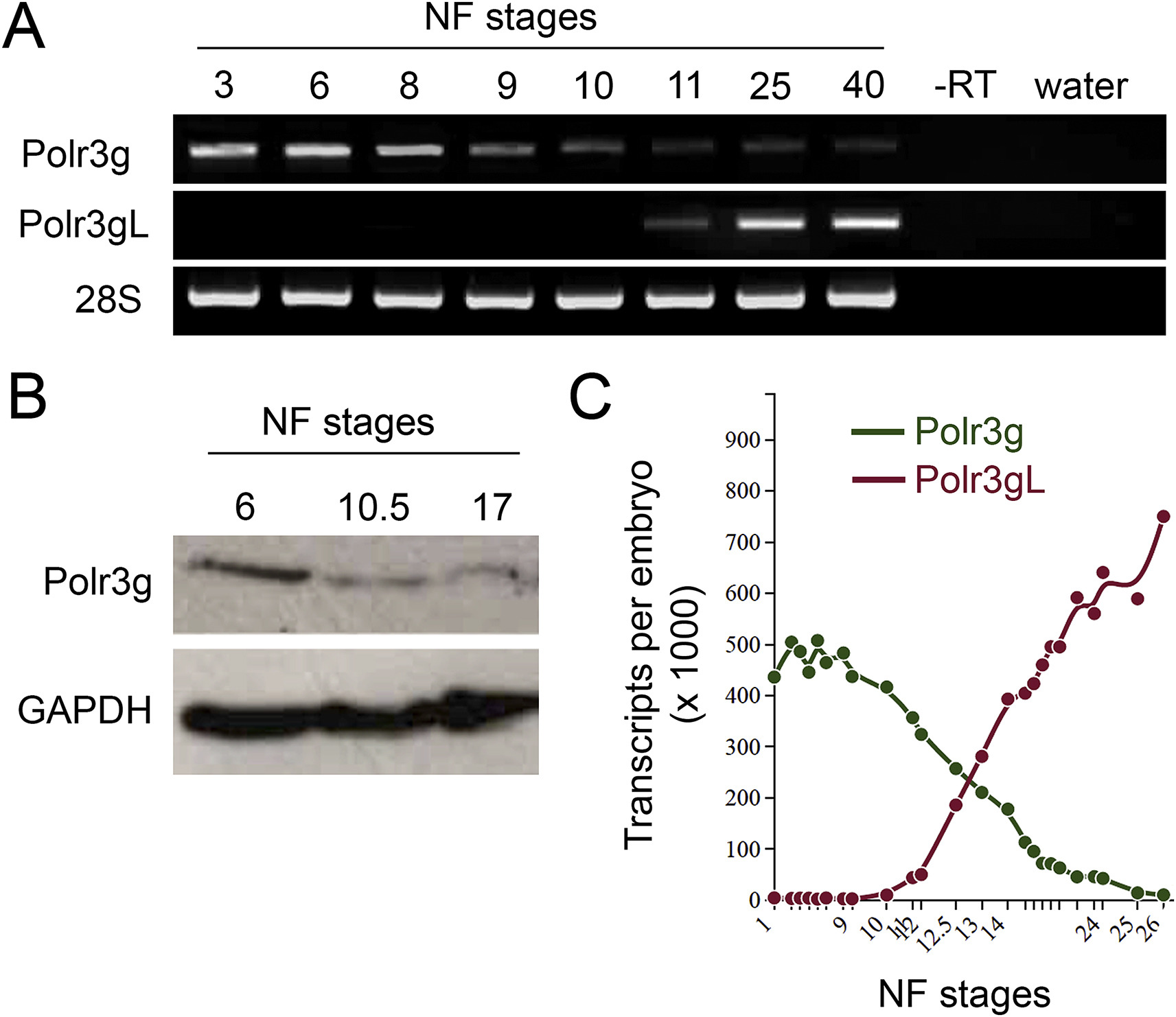 Fig. 1. Temporal expression analysis of Polr3g and Polr3gL expression during Xenopus tropicalis development. (A) RT-PCR analysis of Polr3g and Polr3gL mRNA expression across a stage series of X.tropicalis development. 28S rRNA was used as an endogenous control. (B) Western blotting of protein extracts from a stage series of X.tropicalis embros using an antibody generated against X.tropicalis Polr3g. GAPDH was used as a loading control. (C) Meta analysis of RNA-Seq data for Polr3g and Polr3gL across Xenopus development carried out by Owens et al. (2016) and deposited online via Xenbase.org. |