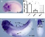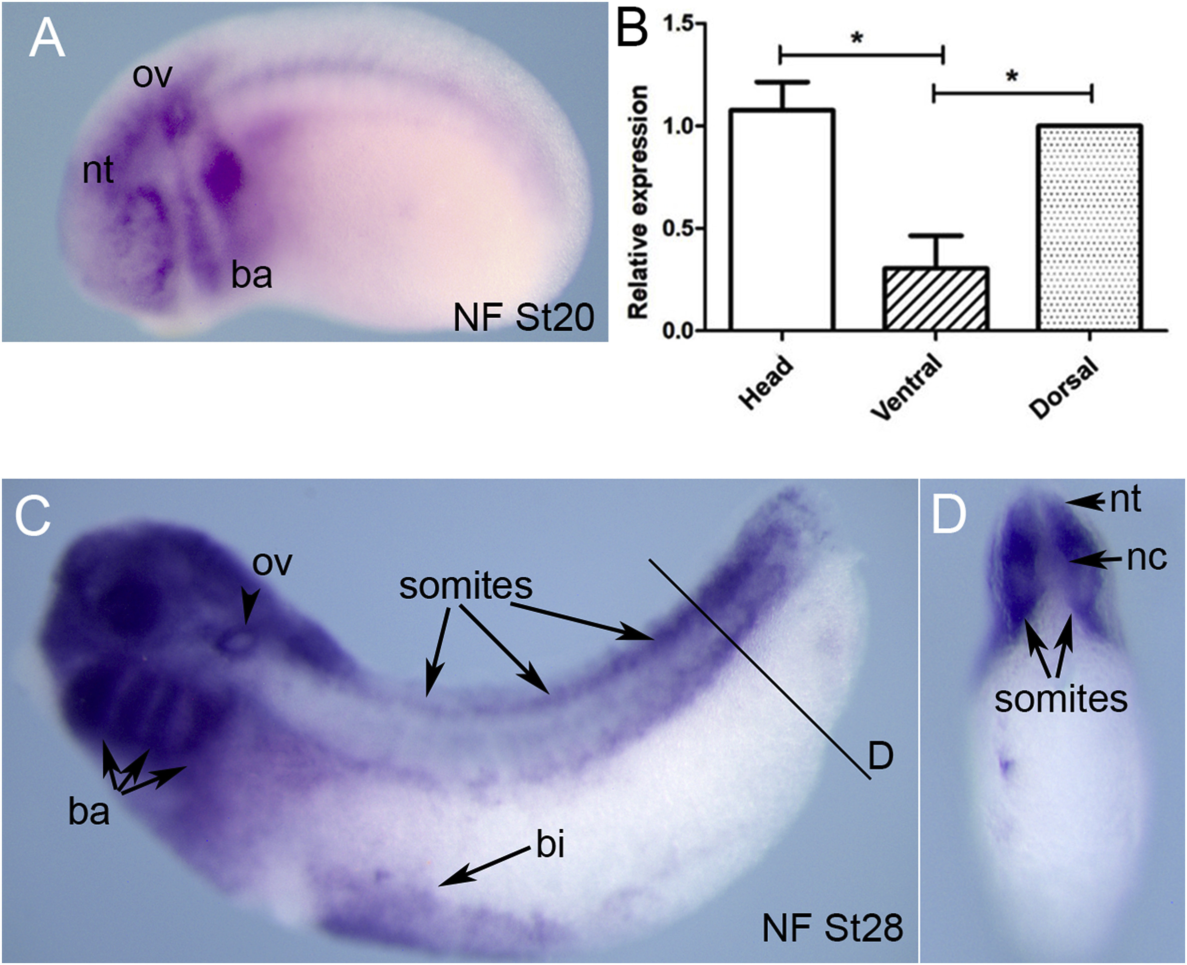 Fig. 3. Expression of Polr3gL in Xenopus tropicalis embryos. Expression analysis of Polr3gL Xenopus tropicalis at NF stage 20. (A) Lateral view of NF St20 embryo analysed by in situ hybridization for Polr3gL; expression in the anterior neural tube (nt), otic vesicle (ov), and branchial arches (ba) is indicated; anterior is to the left. (B) qRT-PCR for Polr3gL expression in the early tailbud (NF St23). Head, Ventral and Dorsal sections were dissected and RNA extracted for qPCR. Ct values were normalised to the gene Dicer. All expression values were calculated relative to somite expression. One-way ANOVA statistical analysis was carried out on relative expression of each section for each gene (*) represents the level of significance. (C) Lateral view of NF St28 embryo analysed by in situ hybridization for Polr3gL; expression in the otic vesicle (ov), and branchial arches (ba), blood island (bi), and posterior somites is indicated. A cross-section through the embryo shown in (D) is indicated; anterior is to the left. (D) Cross section of embryo shown in (C) shows specific expression of Polr3g in posterior somites at NF St28. |
