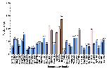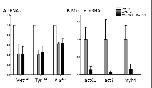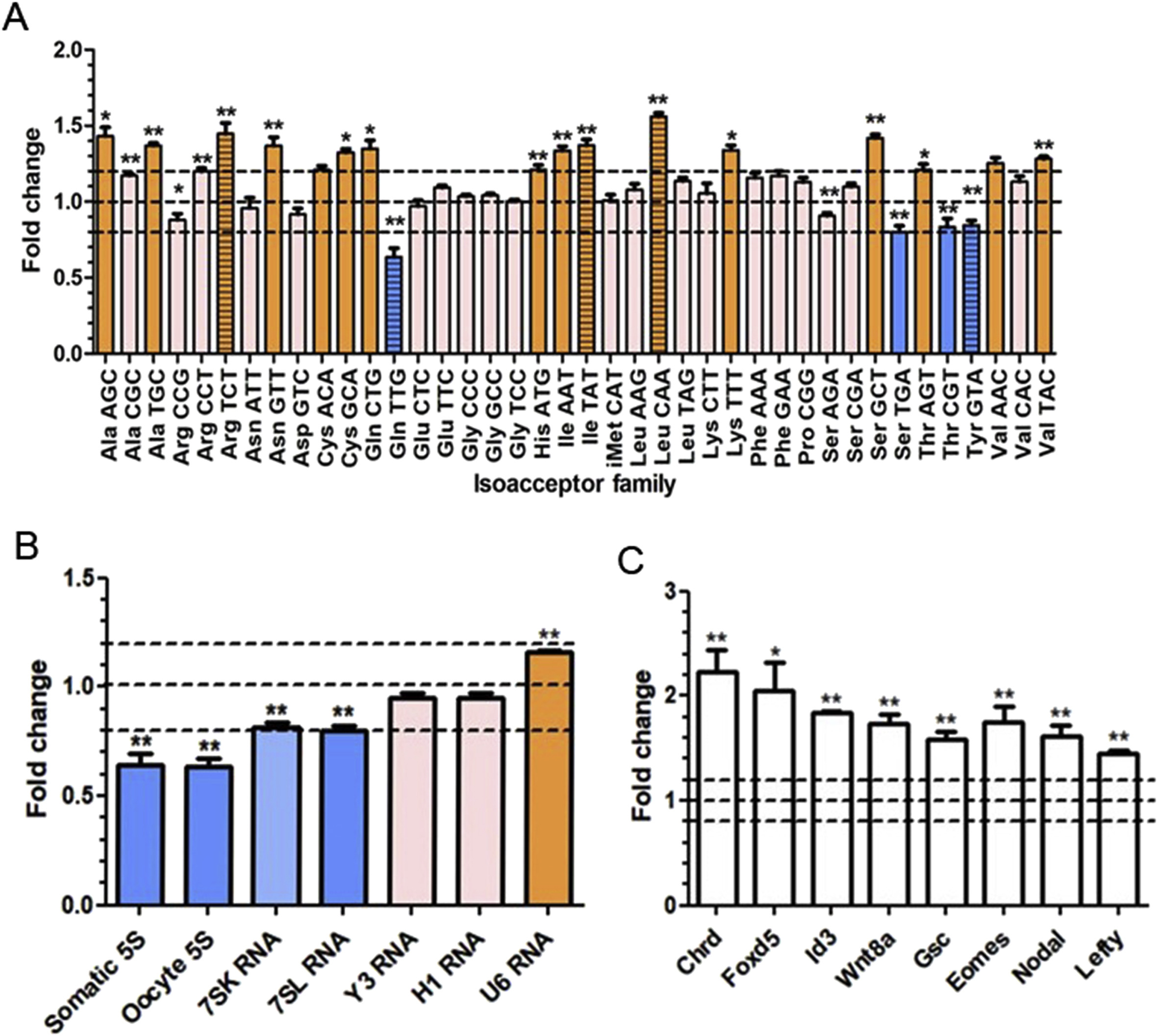 Fig. 4. Changes in tRNA expression in response to Polr3g overexpression. Expression fold change summary of tRNA isoacceptor families in X.tropicalis NF Stage 9 whole embryos injected with 2ng Polr3g mRNA compared to control uninjected stage 9 embryos across 3 biological replicates. Signal data was processed using GeneSpring to determine normalised signal values for each probe within each array, and a normalised intensity reading by comparing probes across the arrays; these values were used to determine expression fold changes for each biological replicate to give an average fold change for each probe across the three replicates. Control and Polr3g injected mean expressions for each of the 5 probes designed per isoacceptor family were then analysed using paired t-tests to determine statistical significance of the change in expression for each anticodon isoacceptor family. To account for multiple comparisons, Bonferroni Correction was applied. (A) Summary chart of fold changes for isoacceptor families with raw signals of >10. Orange indicates significantly up-regulated transcription, blue indicates significantly down-regulated transcription, and pink indicates no significant change in expression. SEM is presented as error bars and * indicates the level of statistical significance. (B) Summary chart of fold changes for other Pol III target genes with raw signals of >10. (C) Summary chart of fold changes for mRNAs upregulated in Polr3g overexpression samples. |