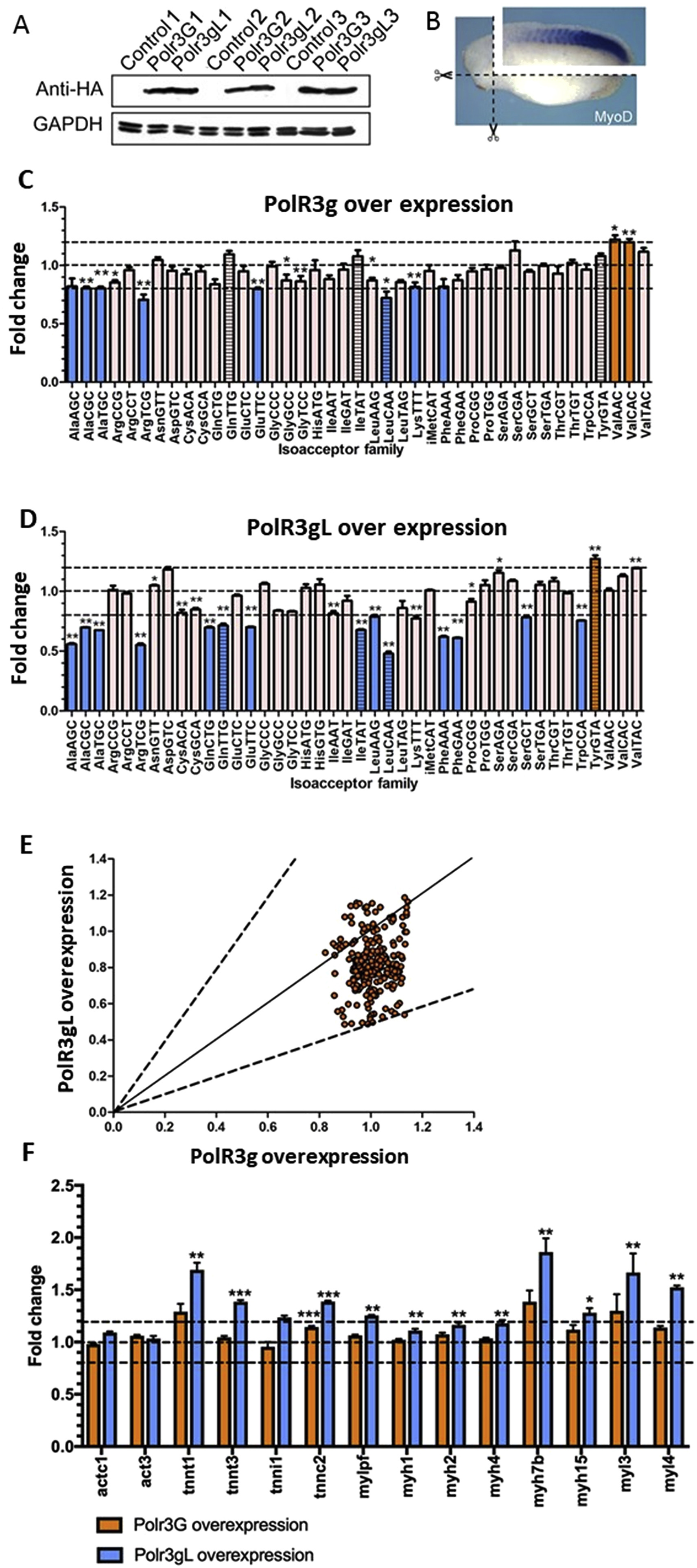 Fig. 5. Overexpression of Polr3g compared to that of Polr3gL in Xenopus tropicalis embryos. (A) 2ng of mRNA coding for HA-tagged Polr3g and Polr3gL was injected into both blastomeres of X.tropicalis embryos at the 2-cell stage and embryos were allowed to develop until NF Stage 25. Western blot analysis of injected and control embryos for detection of HA-tag expression shows equal levels of protein expression in injected embryos. GAPDH was used as a loading control. (B) Dorsal regions were dissected to enrich for myogenic tissue at this stage of development (labelled here by in situ hybridization for MyoD). (C) Expression fold change summary of tRNA isoacceptor families in X.tropicalis NF Stage 25 dorsal sections injected with 2ng Polr3g mRNA versus control uninjected across 3 biological replicates. (D) Expression fold change summary of tRNA isoacceptor families in X.tropicalis NF Stage 25 dorsal sections injected with 2ng Polr3gL mRNA versus control uninjected across 3 biological replicates. Orange indicates up-regulated transcription, blue indicates down-regulated transcription, and pink indicates no change in expression. SEM is presented as error bars and * indicates the level of statistical significance between control and injected samples after Bonferroni Correction. (E) Scatterplot comparing normalised expression of tRNA isoacceptor families in embryos overexpressing Polr3g compared to those overexpressing Polr3gL. Solid line indicates no expression difference. Dashed lines indicate 2 fold change in expression. Polr3g values are on the X-axis and Polr3gL values are on the Y-axis. (F) Expression fold change summary of selected contractile proteins in X.tropicalis NF Stage 25 dorsal sections injected with 2ng of Polr3g (orange) or Polr3gL (blue) mRNA versus control uninjected across 3 biological replicates. SEM is presented as error bars and * indicates the level of statistical significance between control and injected samples after Bonferroni Correction. |