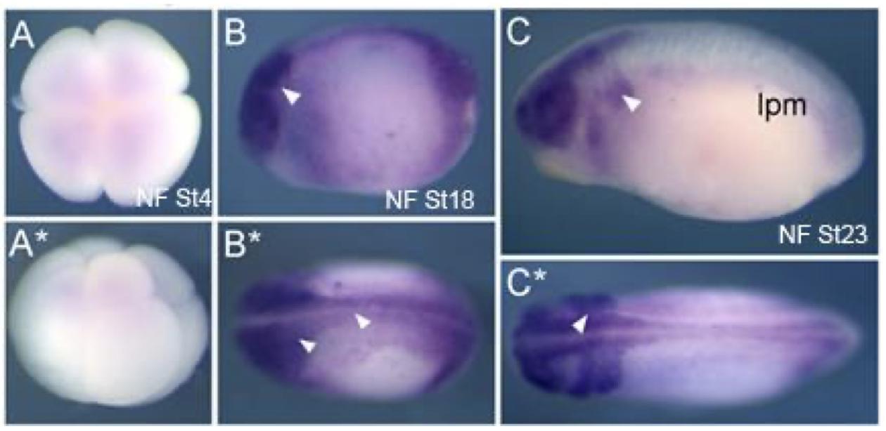 Supplemental Figure 2 Expression of PolR3GL during Xenopus tropicalis development. (A-C) In situ hybridisation of X.tropicalis stage series for Polr3gL. Embryos were collected at cleavage (8-cell) (A-A*), late neural (St18) (B-B*), early tailbud (St23) (C-C*) stages. Arrow heads in B and B* indicate neural plate. Arrowheads in C and C* are branchial arches and neural tube; lpm = lateral plate mesoderm. |