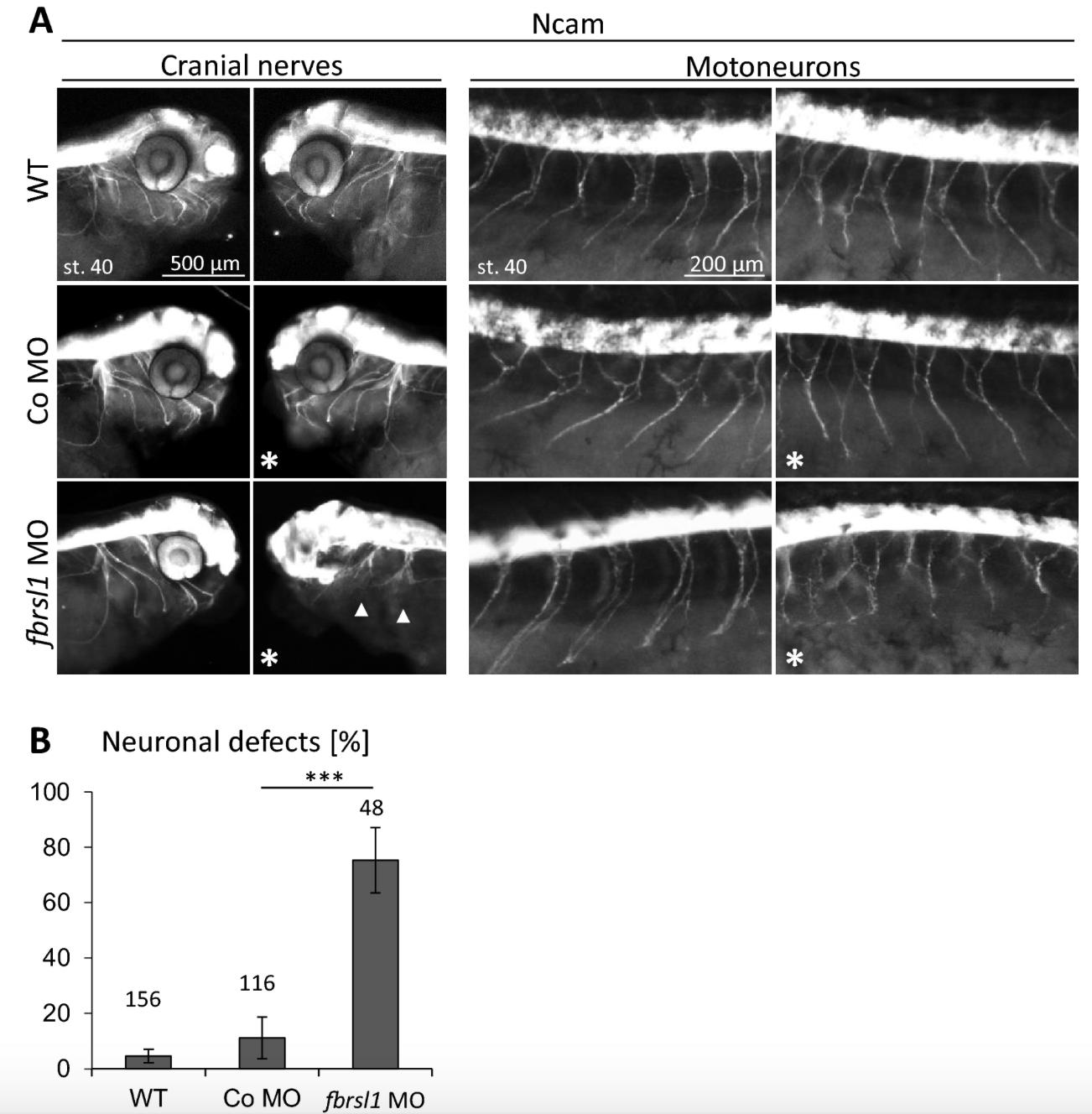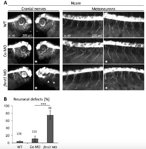 Fig. 6. Neuronal migration is disturbed in fbrsl1 depleted embryos. a Anti-Ncam immunofluorescence staining of stage 40 Xenopus laevis embryos indicate normal neuronal migration of cranial nerves and motor neurons in wild-type and 10Â ng Co MO injected embryos, but disturbed neuronal migration in embryos injected with 10Â ng fbrsl1 MO (arrow). b The graph summarizes three independent experiments, number of embryos (n, above each bar)) and standard errors of the mean are given. ***pâ<â0.001 in a Studentâs t-test and a one-way ANOVA test |