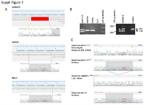 Supplementary Figure 1: Exome data analysis with Varbank (https://varbank.ccg.uni-koeln.de) and results of Sanger sequencing of patient 2 as well as her parents and results of RT-PCR analysis