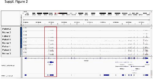 A. For patient 2, only two reads were observed in Varbank for region 12:133085800-133085880 (GRCh37/hg19), each of which showed a 23-bp deletion (12:133085843-033085866), while for the parents only one read without deletion was detected. Sanger sequencing of genomic DNA for this region confirmed the wild-type sequence in the healthy parents and indicated a heterozygous status (frameshift) for the 23-bp deletion in the patient.