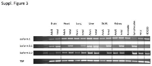 Supplementary Figure 3: Expression analysis performed by RT-PCR on human fetal and adult tissues using cDNA panels (Clontech). In addition RT-PCR analysis was performed on RNA isolated from human lymphocytes and HeLa and HEK293 cells. For isoform 1, a ubiquitous expression pattern was observed, as well as for isoform 3.2, while isoform 3.1 shows a clear expression in fetal tissues, with partial lack of expression in the adult tissues |