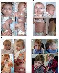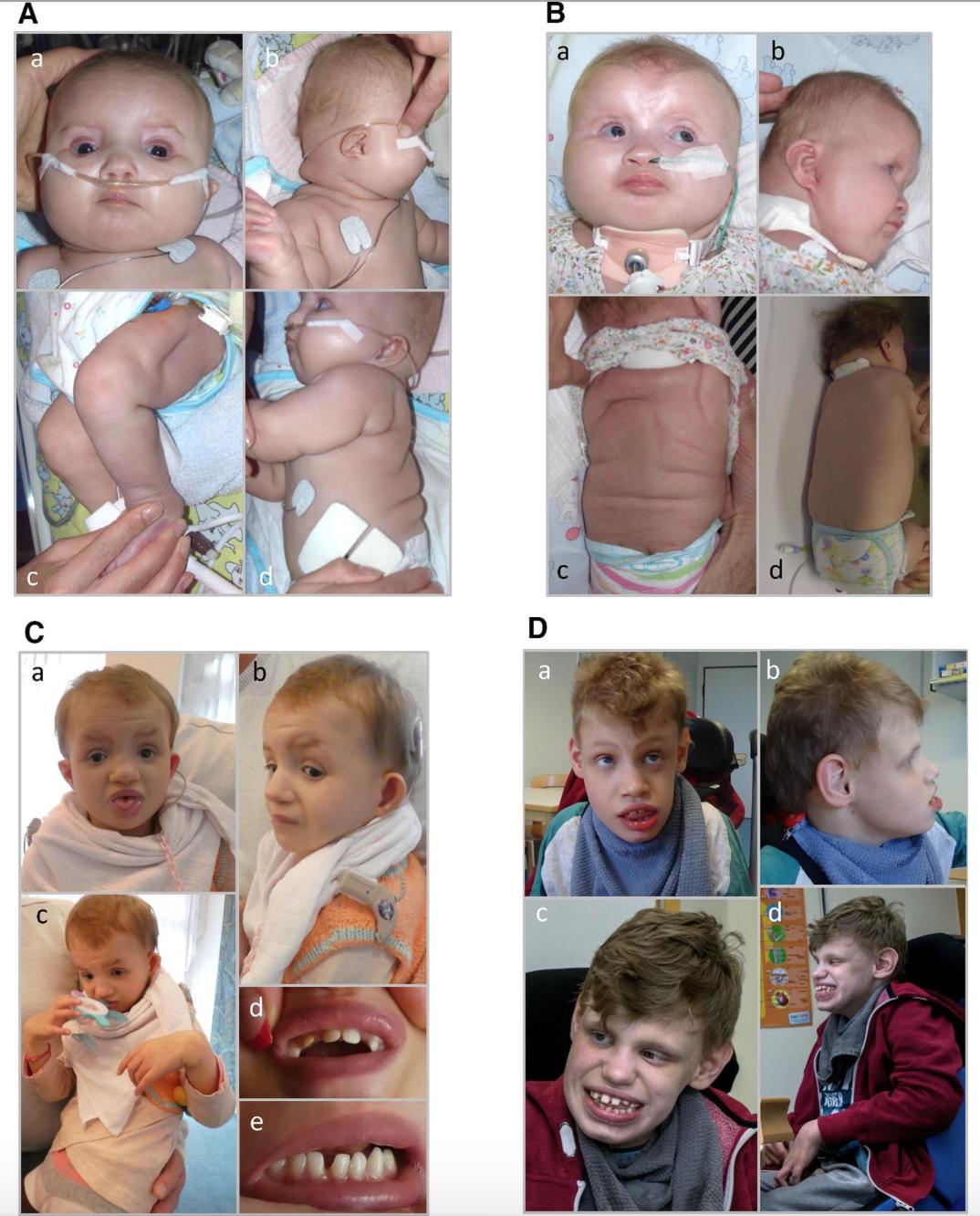 Fig. 1. Clinical representation of the three patients. A Patient 1 at the age of six months: a part of the face b side view showing a pronounced neck fold, a flat back of the head and a dysmorphic auricle c side view of the right leg with wrinkles and d side view with a view of the back area with pronounced skin fold formation. B Patient 2 at the age of five months: a front view showing deep-set eyes, a round face and temporal indentations; b side view, which also shows a flat back of the head and a slightly dysplastic auricle. Due to the fixation of the tracheostoma, the pronounced neck fold is not visible; c view of the back with wrinkles; d view of the back of patient 2 at the age of two and a half years. A remarkable regression of the skin folds was observed. C Patient 1 at the age of 6 years and 7 months: a front-view and b side-view showing dysmorphic features. c Contractures on both hands and fingers are shown (d, e) view of the teeth. D front-view (a) and side-view (b) of patient 3 at the age of 12 years and 6 months. c, d facial appearance of patient 3 at the age of 14 years and 8 months. Contractures of both hands and fingers are observed, as well as wide-spaced teeth |
