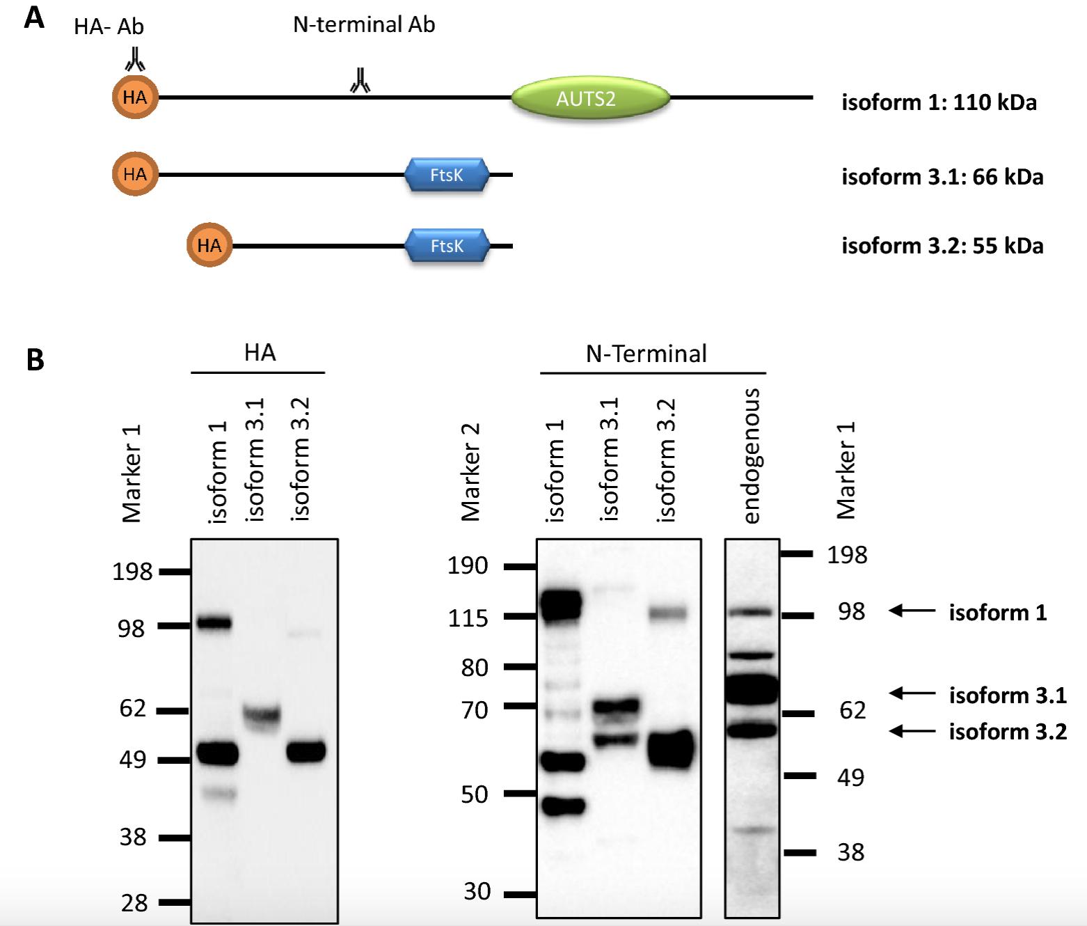 Fig. 3. Western blot analysis of endogenous and transfected FBRSL1 isoforms. a Scheme representation of FBRSL1 isoforms detectable with an N-terminal antibody. The scheme was created using a domain architecture software (https://prosite.expasy.org/mydomains). Isoform 1, consisting of the AUTS2 domain, has a predicted molecular weight of 110 kDa, while isoform 3.1 has a predicted molecular weight of 66 kDa and isoform 3.2 of 55 kDa. Isoforms 3.1. and 3.2 lack the AUTS2 domain and contain a Ftsk DNA translocase domain with an unknown function. b Plasmids containing isoforms 1, 3.1 and 3.2 in fusion to an HA-taq were detected with either an HA-antibody (HA) or with the N-terminal FBRSL1 antibody (N-terminal) in comparison to the endogenous FBRSL1 expression of HEK293 cells. The approximately estimated sizes of 110 kDa, 66 kDa and 55 kDa of the three different isoforms were detected. |