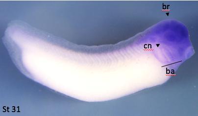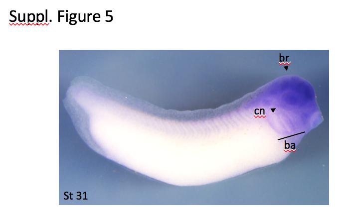 Supplementary Figure 5: Whole-mount in situ hybridization of fbrsl1 mRNA in stage 31 wild-type Xenopus embryos. Fbrsl1 is expressed in the head of tailbud Xenopus embryos. br: brain, cn: cranial nerves, ba: branchial arches. |