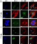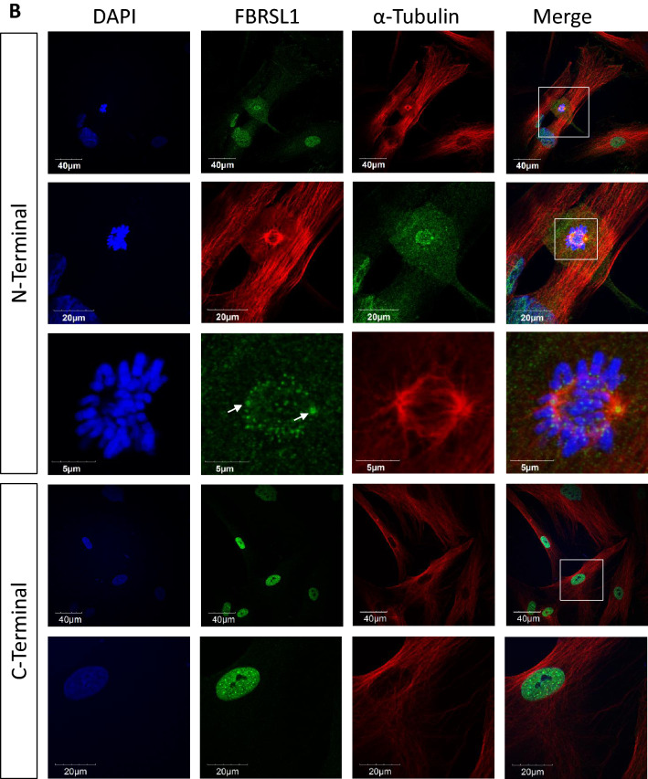 Fig. 4. Immunofluorescence analysis performed on HEK293 cells (a) and human fibroblasts (b). The N-terminal antibody detected isoforms 1, 3.1 and 3.2 in the cytoplasm and nucleus. Interestingly, an association with centrosomes (white arrow) and kinetochores was detected. Staining with a C-terminal antibody, detecting the full-length isoform 1 and additional hypothetic short C-terminal isoforms, showed a mainly nuclear pattern without a co-localization with the mitotic spindle, centrosomes or kinetochores. α-Tubulin was used for cytoskeletal staining and nuclei were stained using DAPI. Images were obtained using a confocal laser microscope withâÃâ600 magnification, and an additional software magnification as indicated in the respectively images |