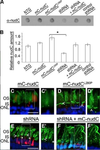 Figure 3- Dot blots of whole tadpoleeyes demonstrate a decrease of nudC in shRNAâtransgenic X. laevis photoreceptors. Expression of mCânudCL280P or nudCâshRNA leads to rhodopsin mislocalization, which is resolved when coexpressing nudCâshRNA and mCânudC. A) Dot blot showing nudCâexpression changes in NTG, mCânudC, mCânudCL280P, nudCâshRNA, nudCâshRNA plus mCânudC rescue, and luciferase shRNA control transgenic animals. B ) Quantification of relative nudC amounts in lysate from whole tadpoleeyes with expression normalized to GAPDH (n = 4â7 per group; 1âway AN OVA, F (4,27) = 4.64, P = 0.007; Tukey's HSD test for mCânudCL280P vs . hairpin, P < 0.01 (*); all other comparisons, P> 0.05). CâF) IHC for rhodopsin (green) in retina cryosections of transgenic X. laevis expressing mCânudC (C , red), mCânudCL280P (D , red), nudCâshRNA (E , red), and coexpression nudCâshRNA (cyan) and mCânudC (red) as a rescue experiment (F ). (D, E ) Intense band of rhodopsin staining at the base of the OS (â§). C â²âF â²) View of rhodopsin IHC without counterstains highlighting protein mislocalization. E) Aberrant rhodopsin in the IS (*). Nuclei marked by DAPI (blue). Scale bars, 20µm.