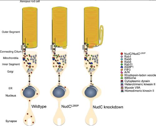 Figure 6- Schematic representation of the regulation of newly formed disk membranes by nudC in X. laevis rod photoreceptors. NudC localizes primarily to the IS and synapse in normal rods with uniform disk membranes in the OS. NudCL280P is present in the IS but does not localize to the synapse. Newly formed disks grow ectopically, spiraling out of the OS, either contained within or external to the plasma membrane. Knockdown of nudC results in drastically overgrown disk membranes and the mislocalization of rhodopsin. Arf, ADP ribosylation factor; ASAP, arfâGAP with SH3 domain, ankryn repeat and pH domain containing protein; NudC, nuclear distribution protein C; rab, rasârelated protein.
