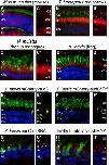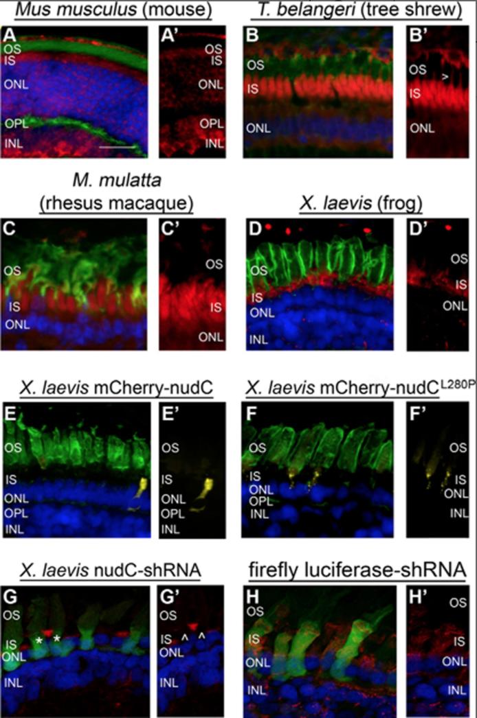 Figure 2- NudC and nudCL280P localizes to the IS and ONL of photoreceptors and can be knocked down upon expression of shRNA against nudC. AâD) IHC of retinal cryosections probing with antibody indicates endogenous nudC (red) is expressed throughout the retinas of mice (A) and is primarily localized to the IS of tree shrew (B ), monkey (C ) and frog (D ) retinas. Photoreceptors are counterstained with WGA (green). NudC stains the axoneme of cone cells (B). A â²âD â²) View of endogenous nudC IHC shown without counterstains. E, F) Expression and localization of mCânudC (E , yellow) or mCânudCL280P (F , yellow) in transgenic X. laevis , counterstained with WGA (green). E,F ) View of mCânudC (E ) or mCânudCL280P (F ) localization shown without counterstains. G ) IHC from transgenic tadpole retinas expressing nudC shRNA (green) probing with antiânudC (red). â§, successful depletion of nudC protein in cells expressing nudC shRNA (*). H ) NudC (red) protein levels are unaffected by expression of shRNA targeting firefly luciferase (green). G â², H â²) View of nudC IHC with nuclear counterstain alone. DAPI (blue), nuclear marker. OPL, outer plexiform layer. Scale bar, 20 µm.