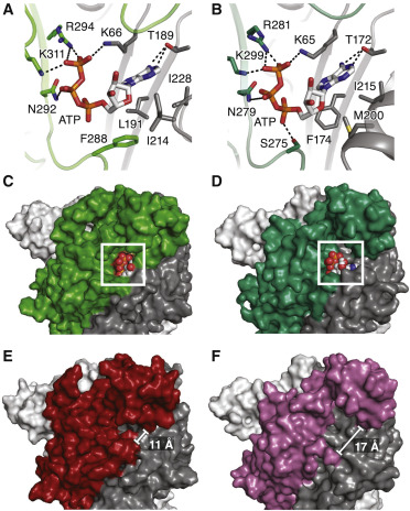Figure 3. Extracellular Orthosteric Ligand-Binding Site (A and B) View of the orthosteric binding pocket, comparing key interactions with ATP in rP2X7 (A) and hP2X3 (B). Two conserved phenylalanine residues (F188 and F293, rP2X7 numbering), proposed to stabilize the ATP-binding pocket, are also similar in both structures (residues not shown). (C–F) Surface representation of the binding pocket for rP2X7 in the open state (C) and apo state (E) compared with hP2X3 in the open state (D) and apo state (F). The apo binding pocket of rP2X7 contains a narrow channel (<11 Å orifice) that shields the pocket from solvent, limiting ligand access. The apo binding pocket of hP2X3 is significantly more solvent exposed (17 Å orifice). The orthosteric binding pocket is at a subunit interface, with protomer A shown in green for open state of rP2X7, forest green for open state of hP2X3, red for the apo state of rP2X7, and red-purple for the apo state of hP2X3. Protomer B is shown in gray, and protomer C is shown in white. |